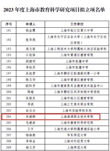 根据市教委《关于组织申报2023年度上海市教育科学研究项目的通知》,经个人申报、专家评审、立项公示,由上海南湖职业技术学院院长朱建柳主持的课题“五年一贯制高职院校‘岗课赛证’综合育人模式探索与实践研究”获批2023年度上海市教育科学研究项目。