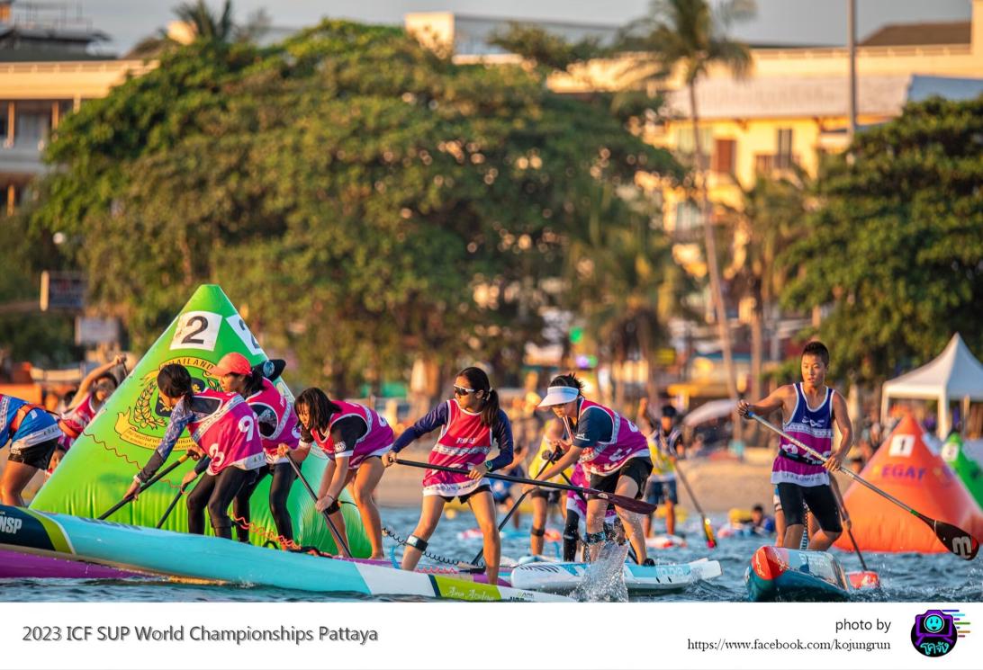 2023年ICF桨板世锦赛于11月15日至19日在泰国芭提雅顺利举办。此次比赛共有来自49个国家的近900名选手参赛,来自上海南湖职业技术学院赛艇队队员、2331融媒体班级的沈梓延同学(图2左一)有幸代表中国队参赛。