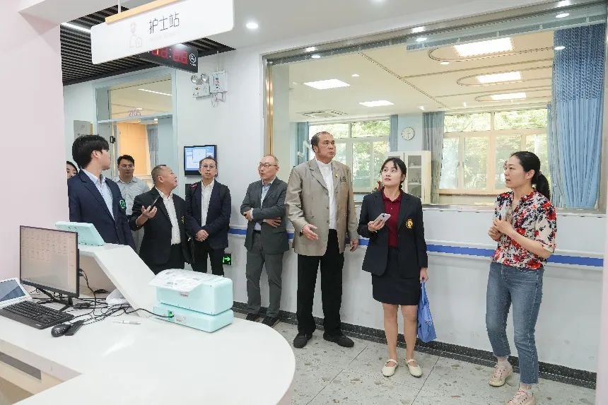 座谈会前,泰国易三仓大学校长和院长一行在朱建柳,院长办公室(国际交流处)主任陈莉莉和智能汽车服务系部主任朱列的陪同下参观了5G数字创意实训中心,国际邮轮开放实训中心,护理实训中心和南湖新能源智能网联汽车实训中心。