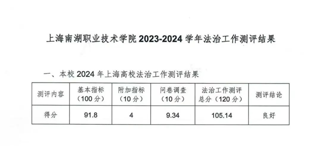 为深入贯彻落实习近平法治思想、习近平总书记关于教育的重要论述,全面推进依法治教、依法办学、依法治校,加强高校法治工作,推进高校治理体系和治理能力现代化,推动学院以良好法治成效服务高质量发展,善用法治方式和法治思维破解学校内部治理难题,进一步提升高校依法治理水平,根据教育部《高等学校法治工作测评指标》、《2024年上海市高校法治工作测评实施方案》和《上海市教育委员会关于开展2023-2024学年高等学校法治工作测评的通知》(沪教委法〔2024〕9号)要求,上海市教育评估院于2024年下半年对上海南湖职业技术学院开展法治工作测评。学院于2021年成立后首次参评,并获评2023-2024学年上海市高等学校法治工作测评“良好”单位。