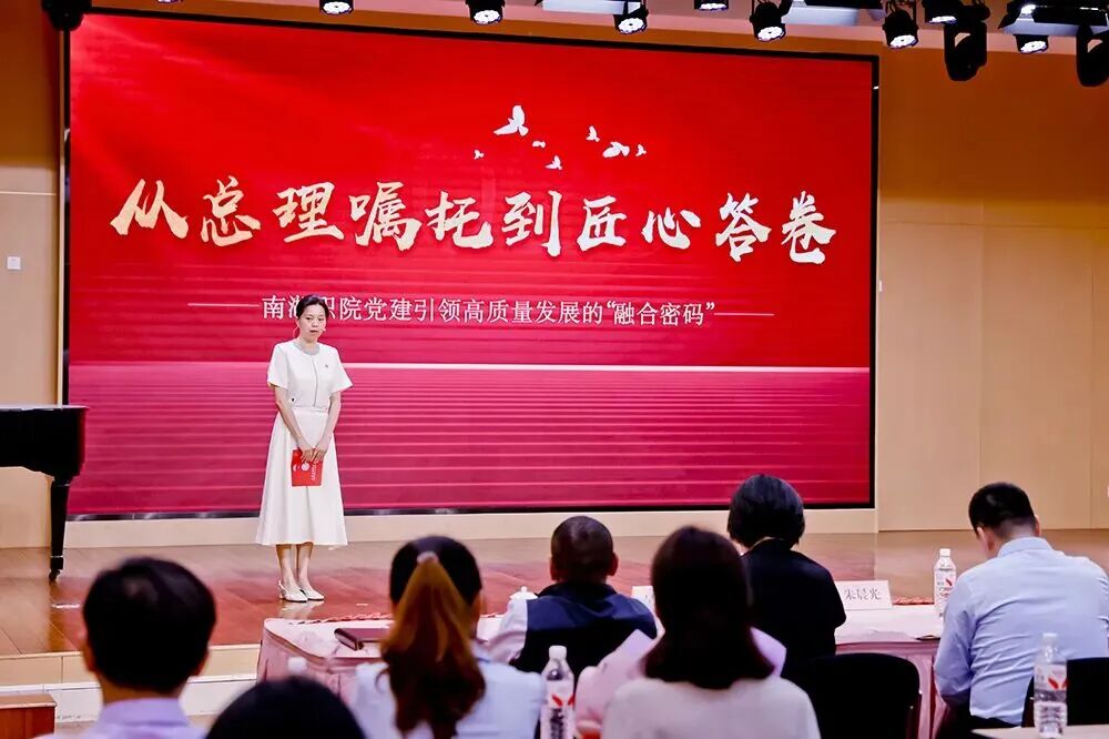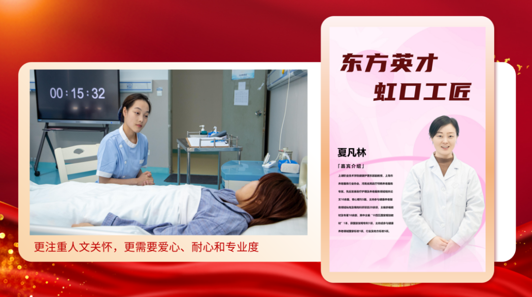 裘燕南以学院“健康护理系部智慧康养专业群建设”为核心主线,解读南湖职院党建引领高质量发展的“融合密码”,深情回顾了2024年11月李强总理调研南湖职院时的重要场景。她生动讲述了健康护理系学生吴梦贤斩获全国乡村振兴职业技能大赛养老护理赛项的金牌后,又是如何践行总理“学好知识技能、满足民生需求”这一嘱托的成长故事,吴梦贤在总理的鼓励下,于毕业后选择投身虹口康而寿养老服务有限公司,让现场听众深刻感受到职业教育学子“以技能回报社会”的责任担当。