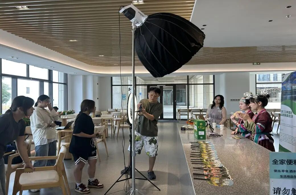 2025年9月26日下午,智慧商旅系网络营销与直播电商专业的2023级与2025级学生,在系部教师与企业导师的共同带领下,前往浦江出入境边防检查站,与校企合作企业邦富达共同开展了一场别开生面的“桂品出乡,侗寨风情”助农直播带货活动。