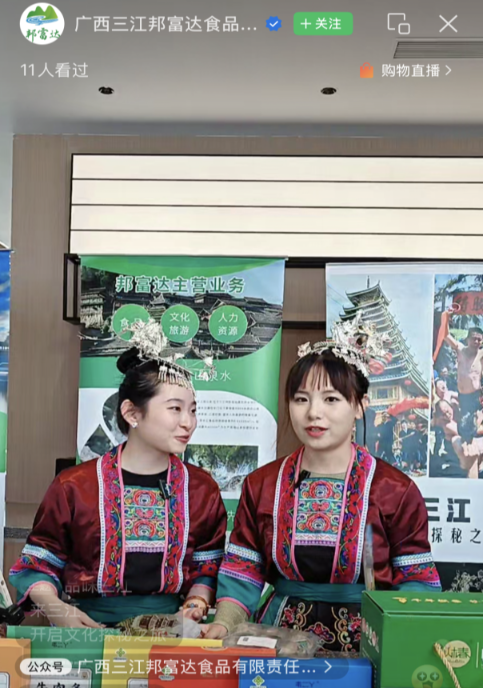 直播间内,来自广西三江的牛肉干、山茶油、黄金罗汉果等农特产品琳琅满目。同学们将侗族特色文化融入销售环节,身着民族风情服饰,打造了一场“以农助旅,以旅兴农”的直播体验。这种融合文旅传播与电商销售的策划,不仅提升了产品的文化附加值,更提升了客户的观看体验,让广大网友在“云端”领略侗寨魅力的同时,心甘情愿为优质农产品“下单”。