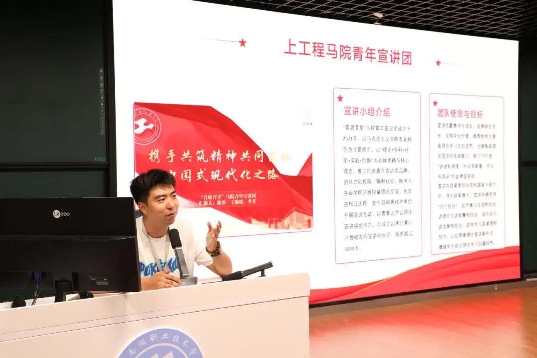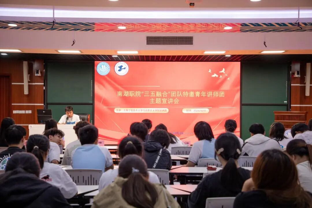 10月17日下午,上海南湖职业技术学院“三五融合”团队本学年首场活动拉开帷幕,特邀上海工程技术大学“青思青享”马院青年宣讲团走进校园,以《携手共筑精神共同富裕的中国式现代化之路》为题,为南湖学子带来了一场有深度、有温度、有共鸣的主题宣讲会。本次活动是“三五融合”育人模式的一次深度实践,旨在引导南湖学子深刻理解时代内涵,激发精神力量,明确责任担当。