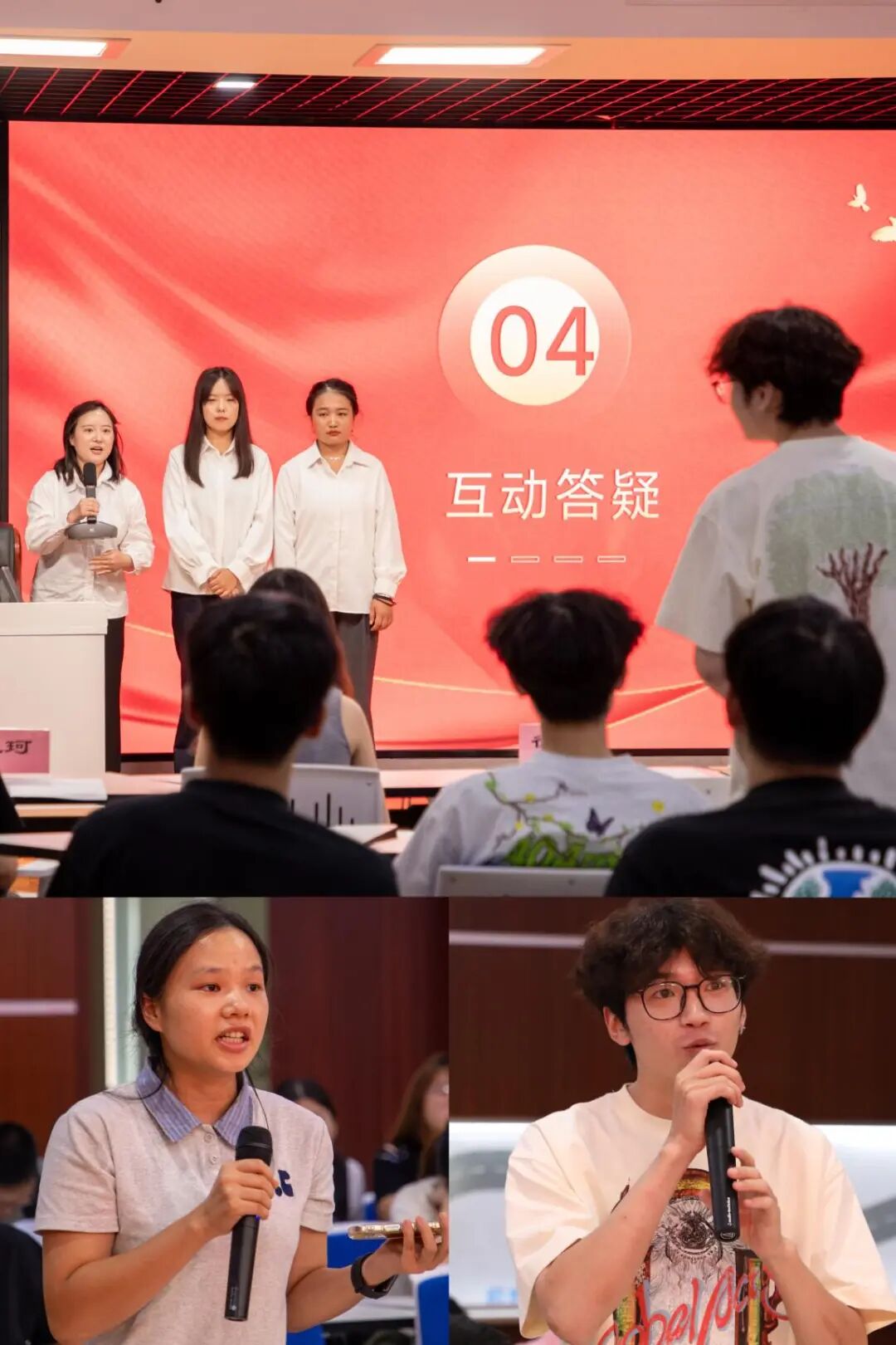 整场宣讲金句频出、案例生动,引发了青马工程学员代表、“三五融合”团队成员等在场同学的强烈共鸣,现场掌声阵阵,气氛热烈。在互动答疑环节,同学们思维活跃,踊跃提问。问题涵盖“如何在专业学习中践行精神共富”、“面对现实压力如何保持积极心态”、“学生社团如何在文化传承中发挥作用”等多个角度。宣讲团成员们结合自身学科背景与实践经验,引经据典又妙语连珠,给予了细致而富有启发性的解答,将现场的思想碰撞推向高潮。