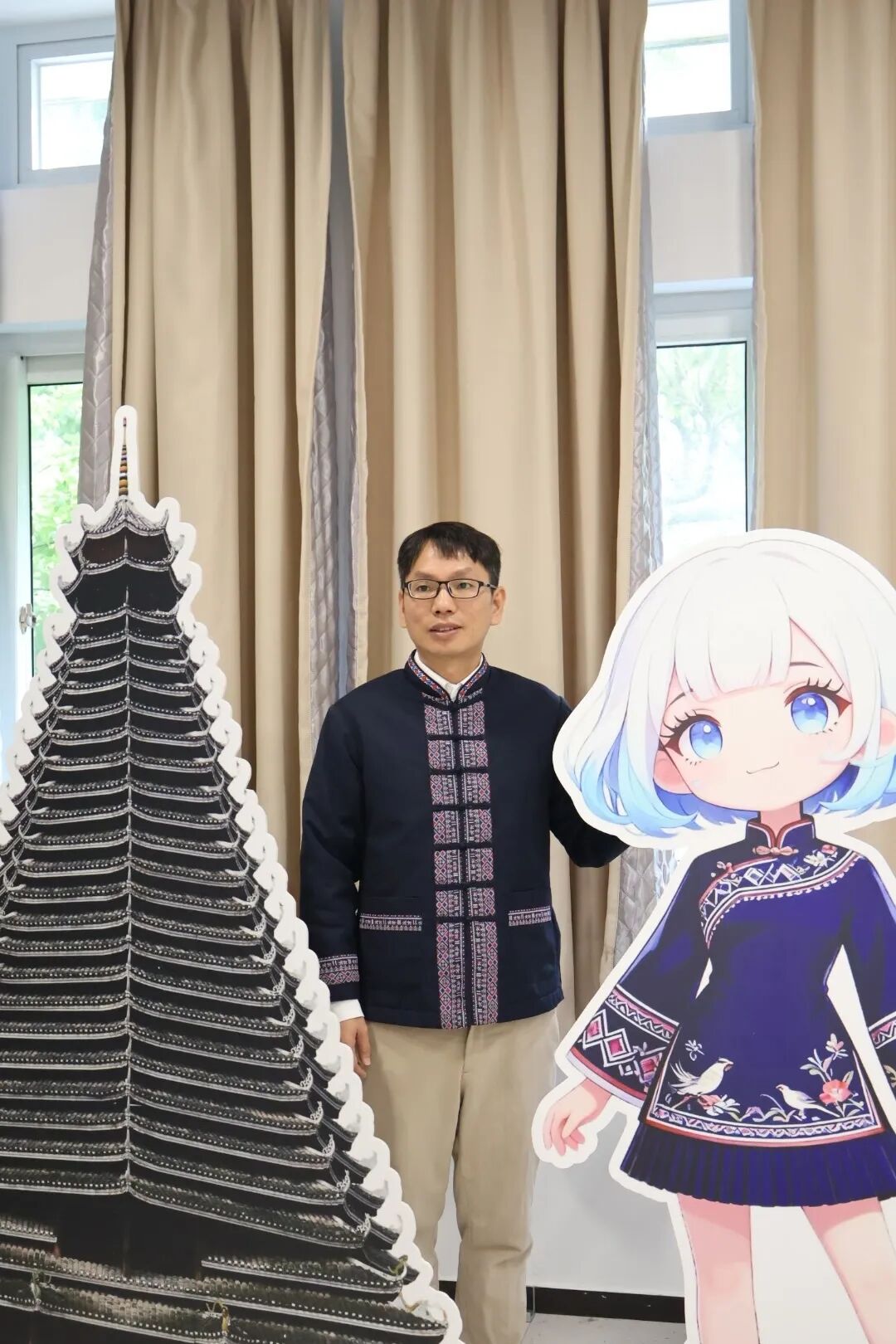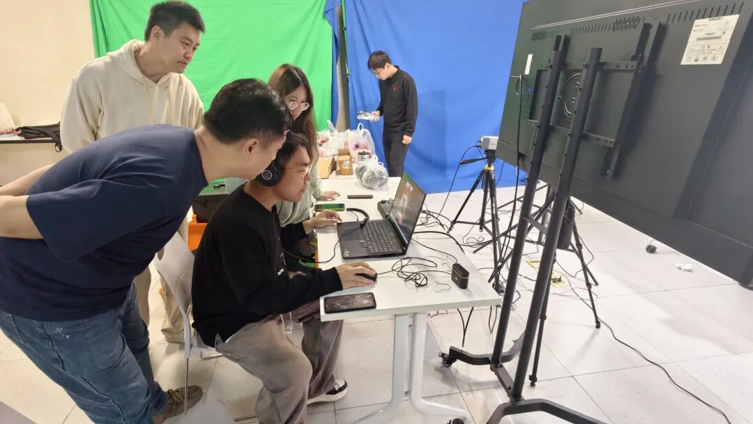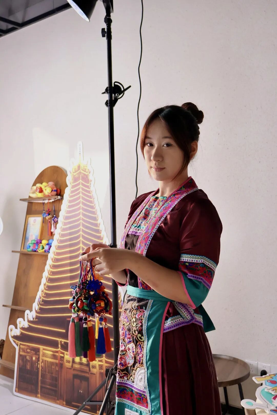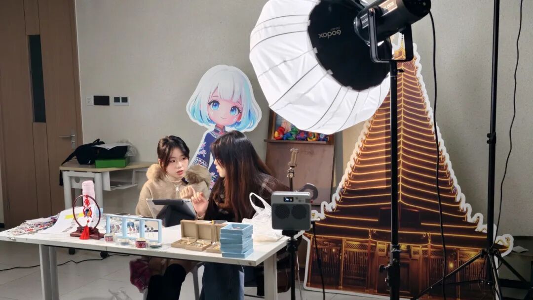 通过设备调试与侗族妆造,打造沉浸式非遗场景。直播团队提前对灯光、摄像头、声卡等设备进行多轮调试,确保画面清晰、声音稳定。为营造沉浸式氛围,学生主播特意换上侗族传统服饰,由专人完成侗族头饰妆造,从视觉上强化“非遗直播”的专业感与文化感。