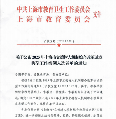 近日,中共上海市教育卫生工作委员会、上海市教育委员会公布了2025年上海市立德树人机制综合改革试点典型工作案例入选名单。上海南湖职业技术学院马院申报的案例《加强上海新型高职联合马院建设,提升马院内涵建设》成功入选。