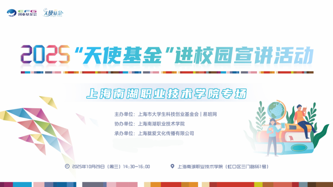 近日,“天使基金”进校园宣讲活动在上海南湖职业技术学院顺利举行。本次活动由上海市大学生科技创业基金会(EFG)联合易班网及相关创业服务机构共同主办,旨在深入推动高校创新创业教育,助力青年学子了解创业政策、激发创业热情、对接创业资源。活动现场气氛热烈,吸引了众多对创新创业充满兴趣的师生参与。