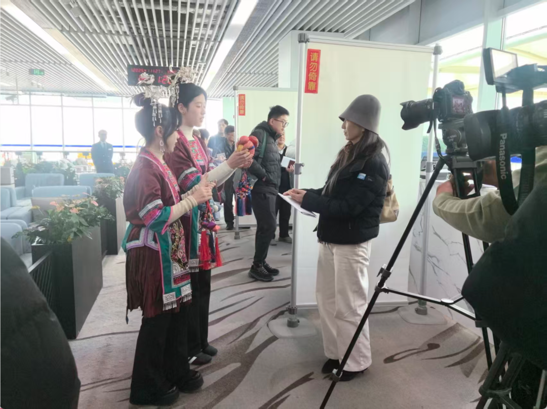 直播正式启动前,身着侗族特色服饰的团队成员率先走进码头人群中。他们手持侗绣耳环、香囊等文创产品,主动向过往旅客介绍面料的质感与纹样的设计巧思,热情邀请大家近距离触摸、感受传统手工艺的温度。鲜明的民族服饰与生动的讲解吸引了大批旅客驻足,现场提问、交流不断,不仅让更多人提前熟悉了侗绣技艺,更成功点燃了现场氛围,为即将开始的直播积攒了超高人气。