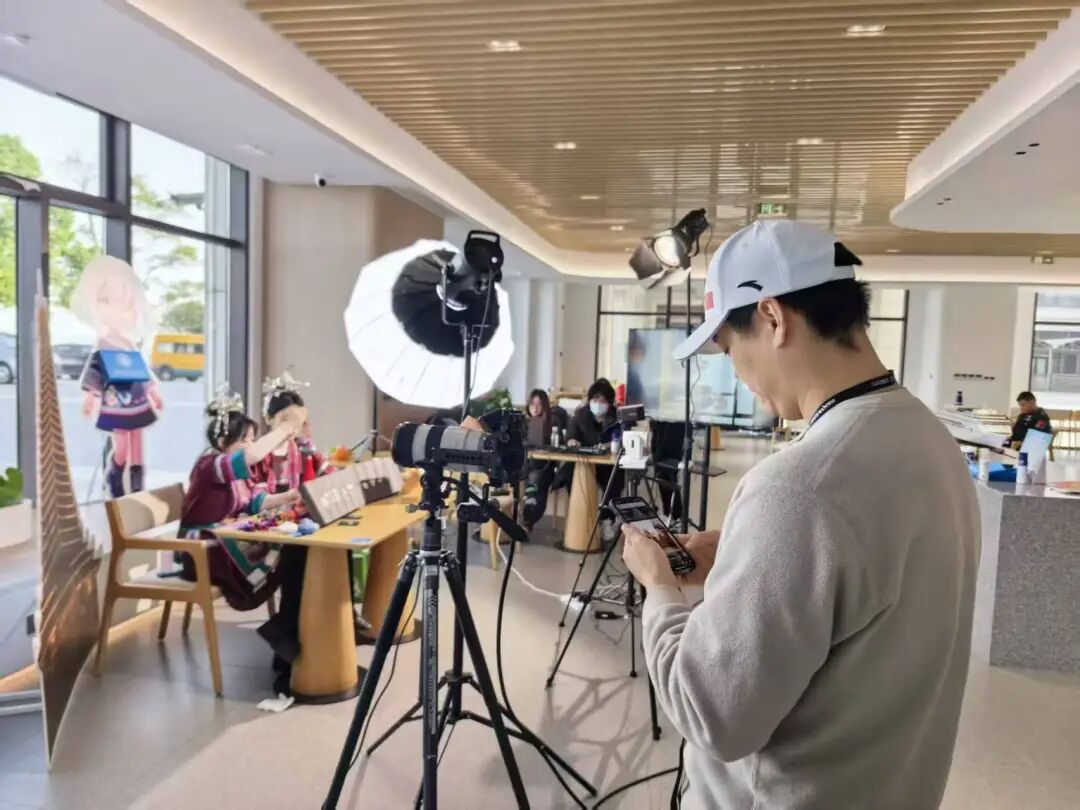 活动前,团队多次召开专项会议,梳理直播流程、打磨产品讲解逻辑,还专门深入学习侗绣的针法演变与纹样背后的故事,力求在直播中精准传递传统技艺的精髓,为非遗传承直播的顺利开启做好万全准备。直播当天,项目团队提前抵达直播现场,逐一对设备进行调试,小到麦克风音量校准,大到直播机位搭建,反复确认设备运行稳定。