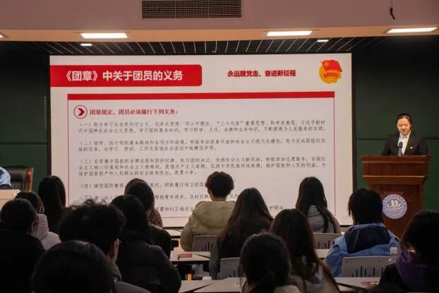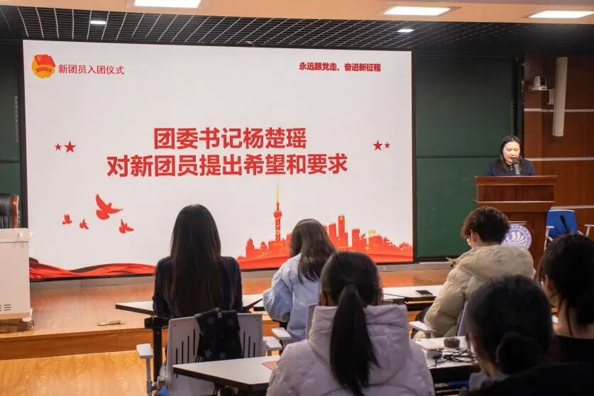 随后,团委副书记郝磊恒老师宣读了新团员名单,并为他们佩戴团徽、颁发团员证。团徽在胸前闪耀,标志着光荣,更意味着责任。展现了南湖学子昂扬向上、奋发有为的精神风貌。