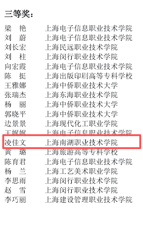 教师层面,凌佳文老师在2025年上海市本科及高职高专院校思想政治理论课教学案例比赛中表现突出,其参赛作品凭借扎实的理论功底、新颖的教学设计与鲜明的育人导向,荣获三等奖,充分彰显了我校思政教师队伍过硬的专业能力与深耕教学的育人情怀。