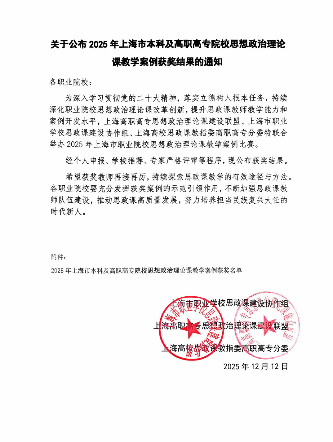 2025年上海市本科及高职高专院校思想政治理论课教学案例获奖名单