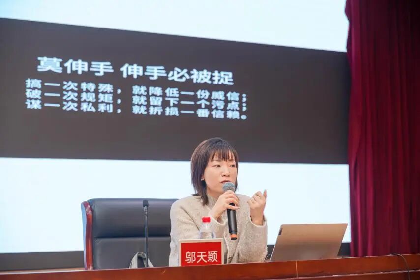 讲座伊始,邬天颖开篇即强调,“行规”是职业发展的底线,而廉洁自律是行稳致远的基石。她引用调研数据指出,多数人晚年遗憾源于职业选择失误与努力不足,提醒学生:职业规划不仅是路径设计,更是价值观的确立。