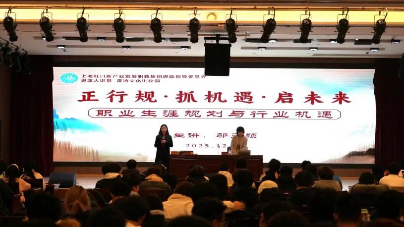 12月19日下午,上海南湖职业技术学院开展以廉洁文化进校园为主题的“思政大讲堂”讲座活动。本期讲座以“正行规·抓机遇·启未来——职业生涯规划与行业机遇”为主旨,特邀上汽集团培训中心(党校)市场部运营总监、上汽职业技术学校理事邬天颖主讲,将廉洁文化教育深度融入职业生涯指导,引导学生扣好职业人生的“第一粒扣子”。