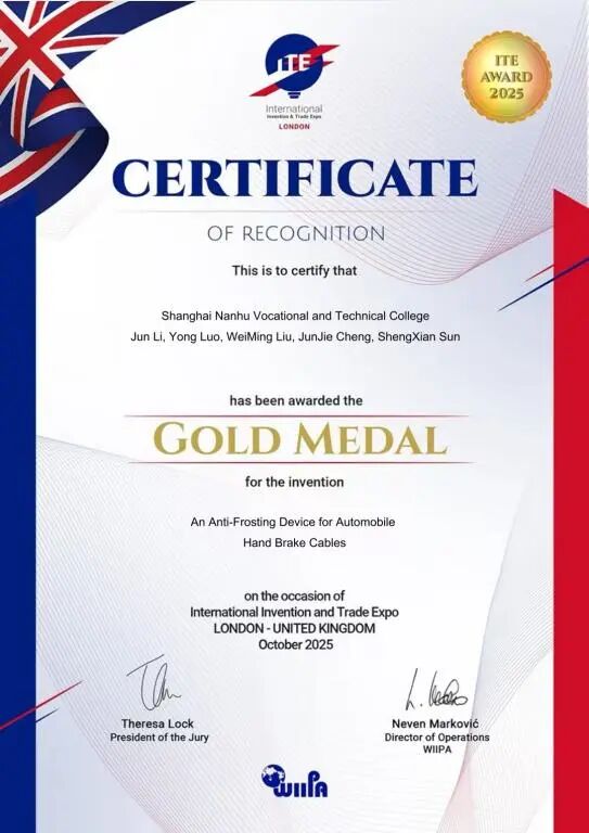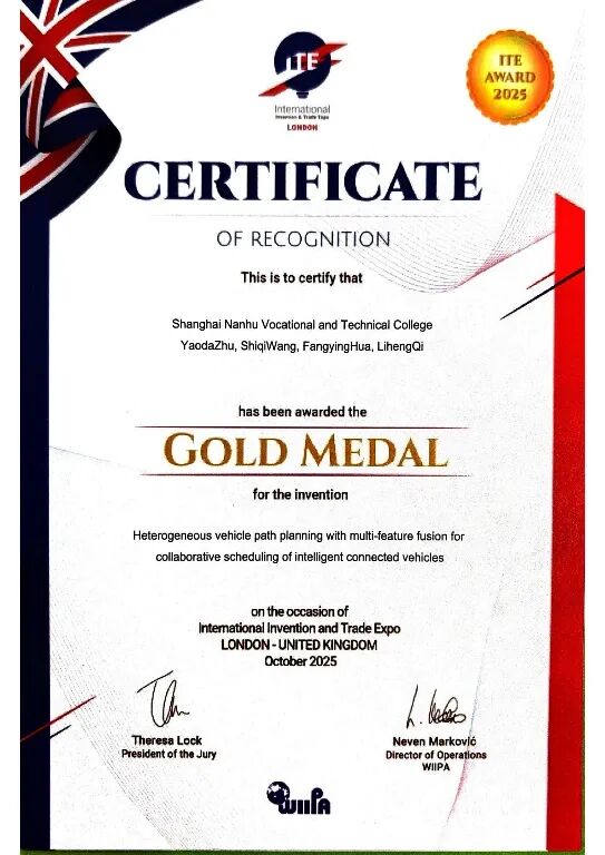 上海南湖职业技术学院智能汽车服务系师生团队表现突出,其中李骏、罗勇老师指导智能网联汽车2352班刘伟铭、程俊杰和智能网联汽车2251班孙圣贤完成的项目《一种汽车手制动拉索防结霜装置》,以及朱耀达、朱列、寻桂莲老师指导智能网联汽车2351班王诗琪、华芳莹、祁立衡完成的项目《智能网联汽车协同调度多特征融合的异构车辆路径规划》,均荣获金奖。