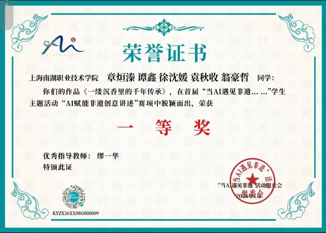 我院数字创意系数媒2331班的两支队伍在缪一华老师的专业指导与悉心培育下,凭借对非遗文化的深度理解与AI技术的创新应用,在全国五千多个参赛作品中脱颖而出:其中以章烜溱、谭鑫、徐沈媛、袁秋收、翁豪哲同学组成的团队以作品《一缕沉香里的千年传承》斩获一等奖,同时获“青年非遗传习人”奖;以王晶、齐贵然、廖羚莉、李书语同学组成的团队的作品《香火新生》亦摘得一等奖,用青春创意诠释了“非遗+AI”的融合新范式。缪一华老师荣获“优秀指导教师奖”。