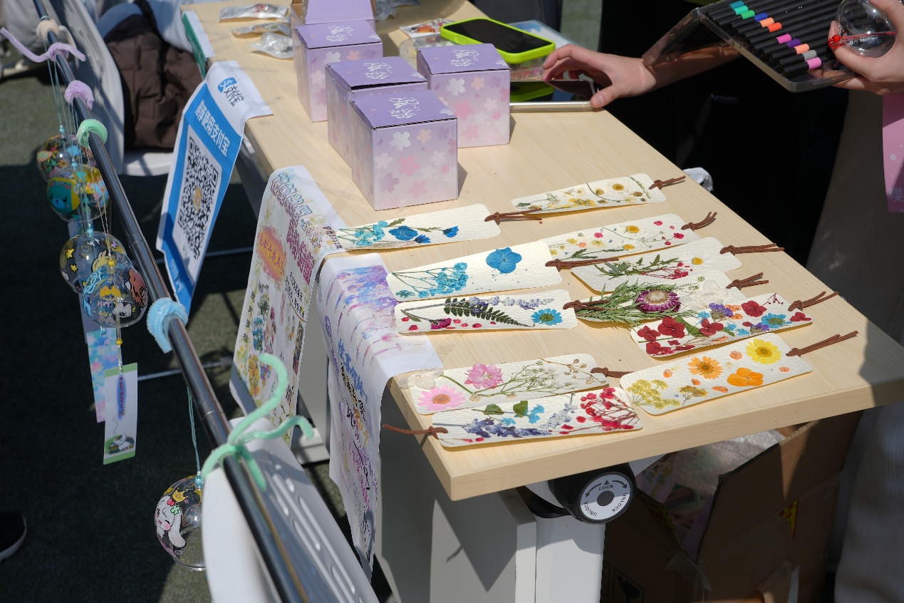 花艺摊位上各色鲜花争艳,春意盎然。学生团队分工明确,进行花枝修剪、色彩搭配与花束包扎,吸引了师生驻足观赏与选购。