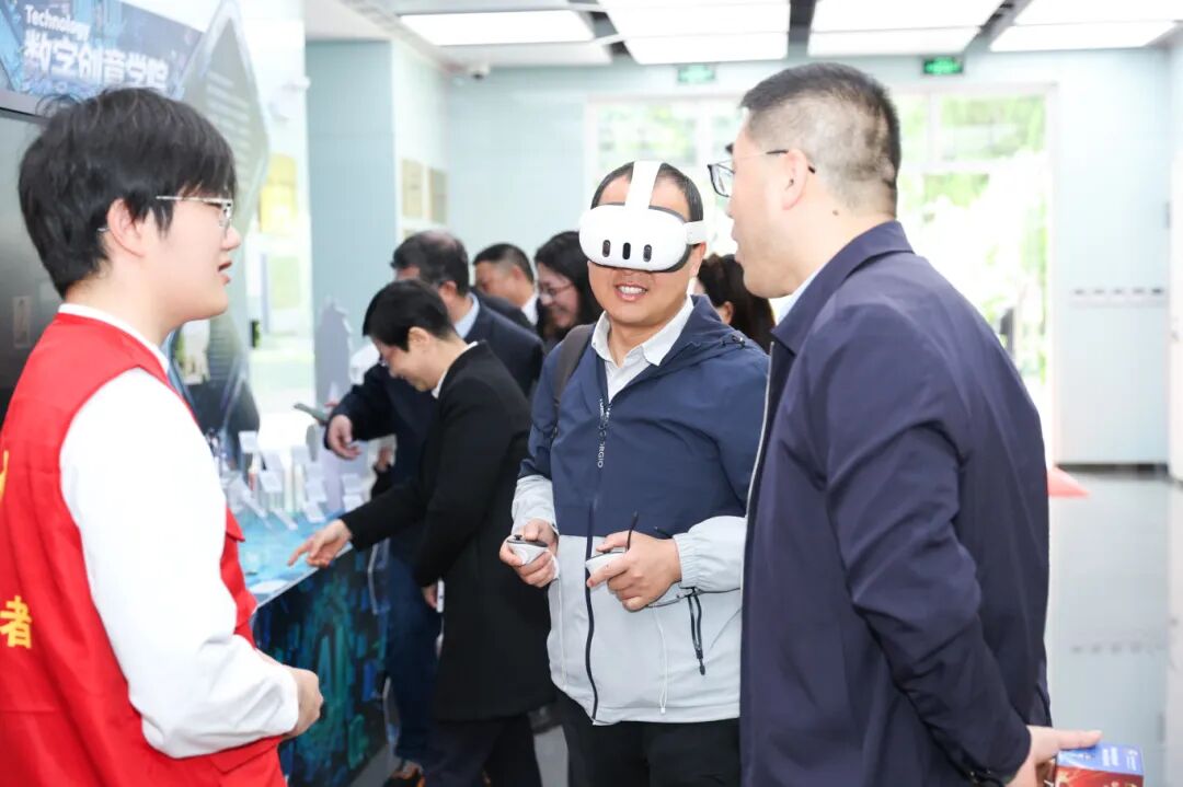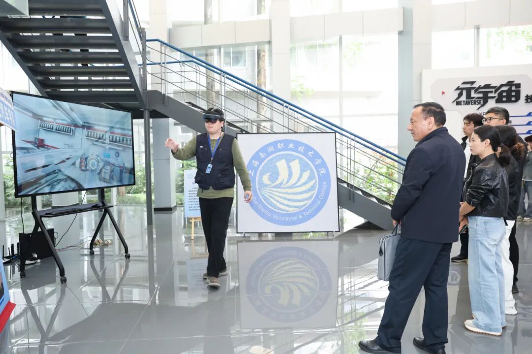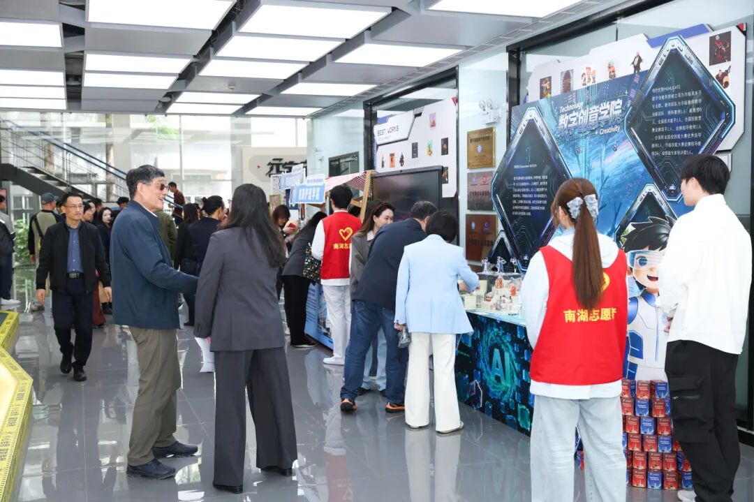 会前,与会嘉宾通过实地参观体验学院数智化特色教学成果:智能汽车学院5G+XR项目、数字创意学院“AR视界”创新体验项目、数字创意学院“喵趣盲盒”特色体验项目、健康护理学院“VR智慧照护+暖熊温情陪伴”项目、智慧商旅学院“真人主播+数字虚拟人”直播项目,全面感受学院数字化转型与实践育人创新成效。