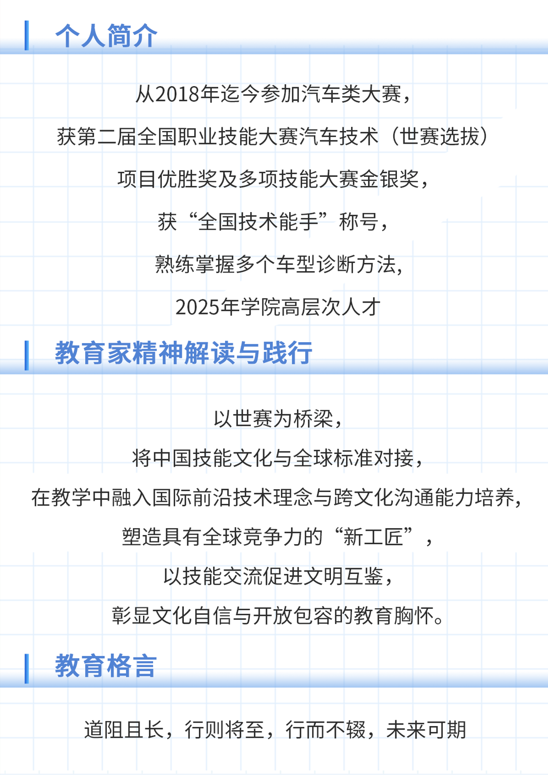 追梦之路布满荆棘。在第46届世赛上海选拔赛中,他虽获第二名,却因实战经验与时间把控的不足止步全国赛。这次失利成为他蜕变的起点。他清醒地认识到,世赛不仅考验技术的熟练,更是对国际标准、系统思维与心理素质的极致挑战。为此,他深入汽车企业一线,沉淀三年,跟随资深技师处理了200余个真实故障,完成了从“懂理论”到“精实战”的蜕变。这段宝贵的行业经历,不仅夯实了他的技术根基,更成为他日后教学中取之不尽的“活教材”。