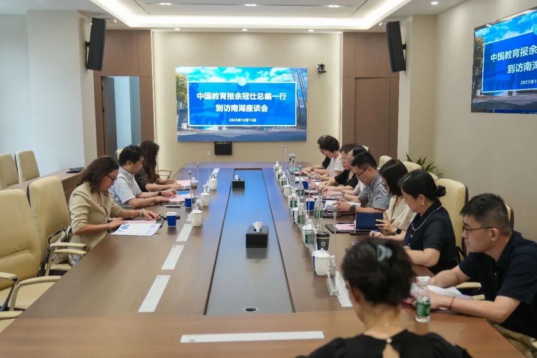 10月13日,中国教育报刊社副社长、中国教育报总编辑余冠仕一行调研上海南湖职业技术学院,围绕上海职业教育发展特色、人才培养创新模式、职业教育宣传等主题开展交流。中国教育报职教周刊主编翟帆,上海市教育委员会职教处副处长俞文达,中国教育报上海记者站记者任朝霞,虹口区教育局副局长、南湖职院党委书记李琰,南湖职院党委副书记、院长朱建柳,南湖职院副院长朱清清、胡跃忠,上海工艺美术职业学院校长宋磊,上海科创职...